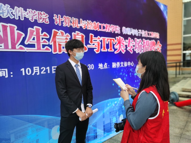 在走访中我们了解到,面对今年疫情影响下的就业压力,有些同学有些同学略显焦虑,信心不足。但是不少同学心态轻松,并表示自己做足了功课,明确了将来要工作的方向,对找到工作充满信心。来自物电学院2017级电子信息科学与技术专业的陈一帆同学表示,自身比较期待与专业相关的岗位,这是自己的兴趣点也是特长点,希望通过今天的招聘会进一步了解相关岗位的招聘要求,最终找到较理想的岗位。