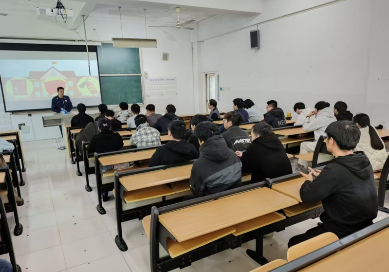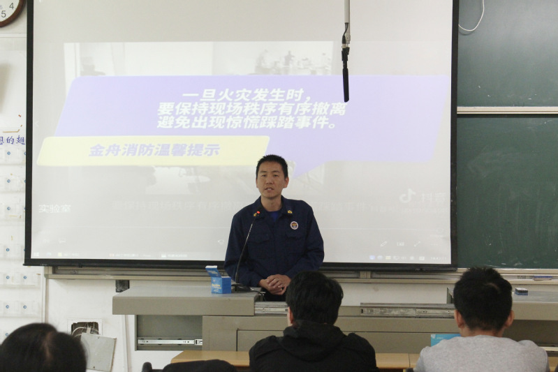 在教学楼3B201教室内,闽侯县上街消防救援站的刘晨辉班长以《筑牢消防安全防线,让火灾远离校园生活》为题,结合案例视频,生动直观地讲解了实验室消防安全和电动车消防安全,并着重介绍了火灾发生时的正确逃生技巧。