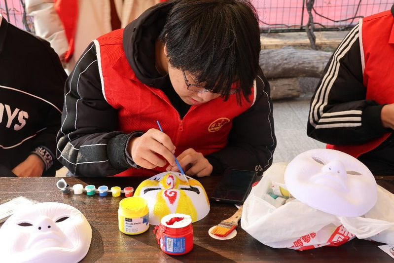 活动伊始,同学们在志愿者的指导下进行脸谱绘制。脸谱承载着中华民族千年的文化记忆,以鲜明的色彩和独特的图案展示匠人智慧。同学们或遵循模板,或自主创新,用一抹抹丹青描绘世间百态。一幅幅脸谱作品生动呈现了传统艺术的魅力,也寄托了对民族文化的敬意。
