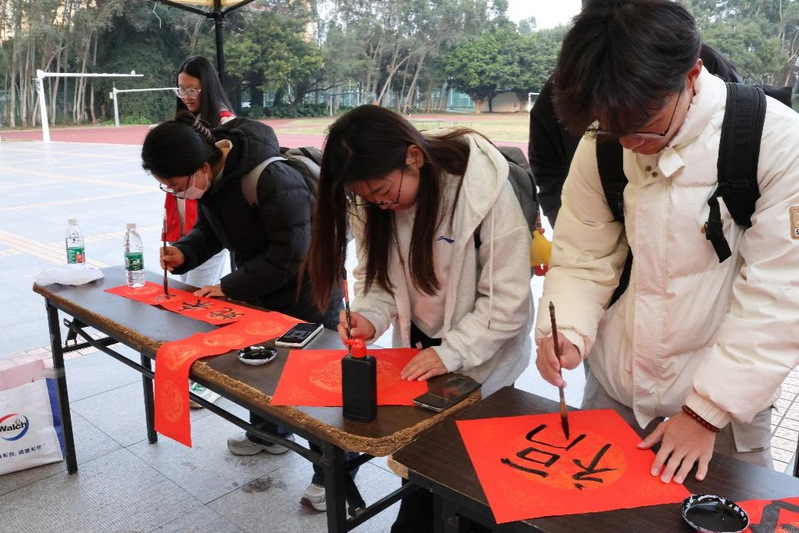 在写春联环节,浓浓的墨香弥漫现场。同学们一边书写“福”字和对联,一边感受新春的喜庆氛围。虽然书法略显稚嫩,但笔画间充满了青春活力与对未来的美好期盼。红纸黑字,寓意吉祥,洋溢着浓浓的年味。