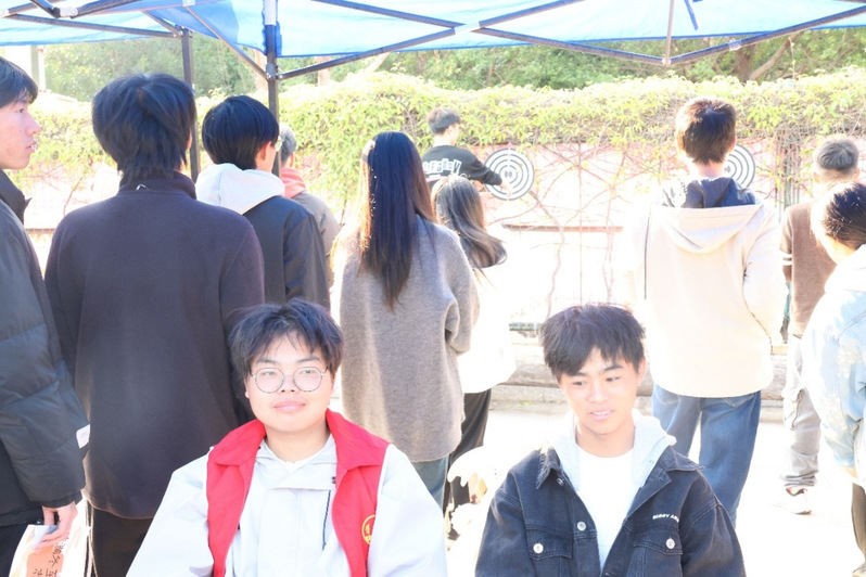 负责飞镖组的同学及排着长队等待参与游戏的同学们