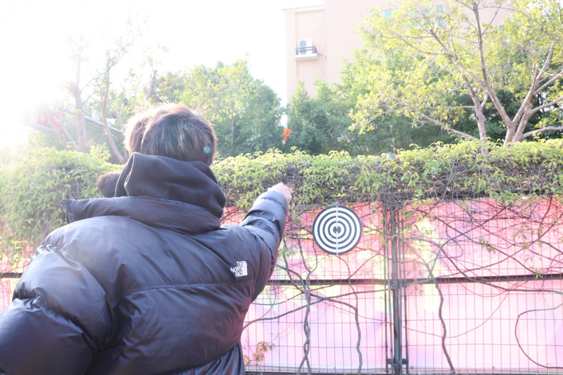 “开弓没有回头镖”小游戏中,同学们与志愿者一同竞技,飞镖掷中靶心的一刻,掌声和欢呼声此起彼伏。轻松的游戏成为释放学习压力的良好途径。