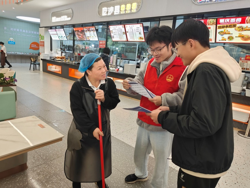 急救技能教学结束后,志愿者们分组走进校园不同场景进行宣传。他们不仅在校园主干道上向来往的同学普及急救知识,还深入教学楼、图书馆、操场等地,向自习、运动、休憩的学生们发放宣传单并耐心讲解。同时,志愿者们主动走进各大食堂,向辛勤工作的保洁阿姨与食堂工作人员介绍急救技能在日常生活中的重要性与实用性,获得了大家的积极回应与支持。