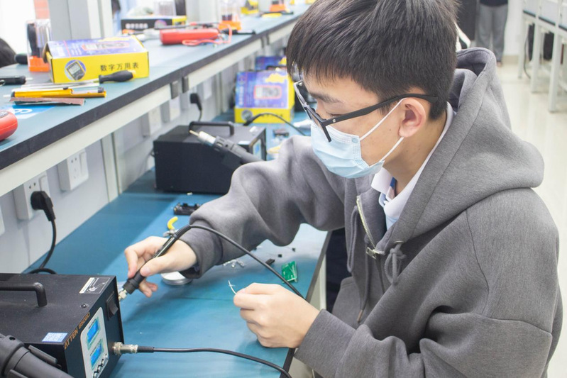 比赛现场,50 余名选手早早候场,蓄势待发。随着开赛指令下达,场内瞬间安静下来,只听得电烙铁发出的低频嗡鸣声与焊锡丝细微的轻颤声交织。选手们全神贯注,手指灵活操作,在电路板上精准定位电子元件,流畅走线,焊点如繁星般均匀散落。他们专注投入的神情与娴熟利落的动作,充分展现了扎实的专业功底,也深深感染了在场的每一位观众和评委。