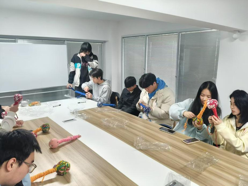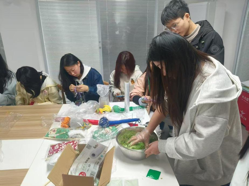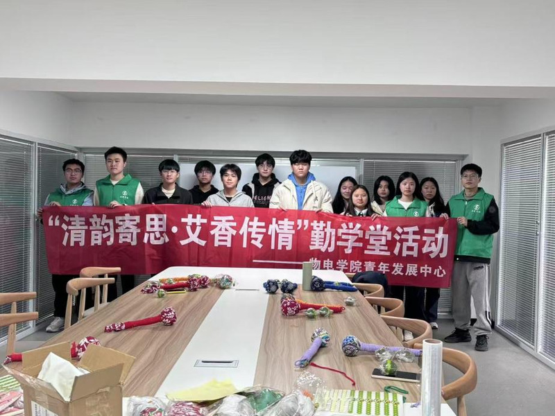 活动现场弥漫着艾草特有的清香,首先通过多媒体影像重现《清嘉录》记载的虎形艾锤制作场景。学生们在指导下将艾叶、桂枝等中药材装入粗麻布袋,运用十字缠绕法固定木柄,最终制成兼具养生功能与文化寓意的艾草锤。每一道捆扎工序都需控制力度,这让我体会到传统手作的匠心理念。2023级物理学(师范类)专业郭梓杰同学展示作品时说道。