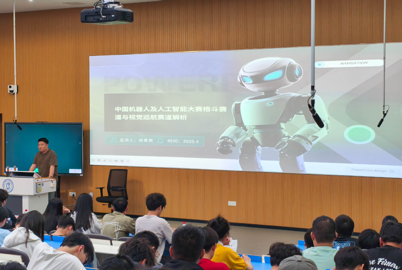 2022级机械电子工程班肖青泉学长分享了中国机器人及人工智能大赛格斗赛道与视觉巡航赛道经验,强调机器人设计的模块化、安全防护,以及多学科融合的团队协作,并建议大家善用实验室资源、提升实践能力。