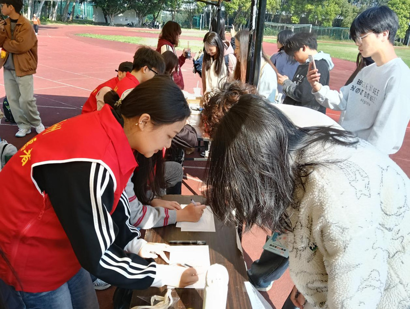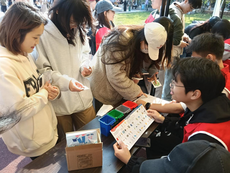 活动当天,志愿者们在致强田径场支起帐篷。同学们纷纷来到现场,领取集章小卡片,开启了一次别开生面的“环保游戏探险”。