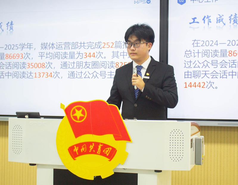 伴随着共青团团歌,学生会主席、团委学生副书记、各中心主任等学生干部依次上台述职,对一学年来的工作情况进行全面汇报,并对下个阶段的任务和目标进行了总结反思。