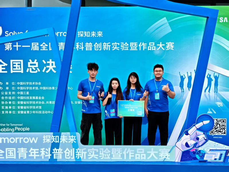 7月28日至31日,由中国科学技术协会主办,中国科学技术馆、中国科协青少年科技中心承办的第十一届全国青年科普创新实验暨作品大赛全国总决赛在安徽合肥举办。色色啦 “海净先锋”团队(成员:周乃森、刘喆锴、卢斯羽、林馨,指导教师为物电学院陈红星和刘辰两位博士)。经作品展示、现场路演和问辩等环节,荣获创意作品——人机协作(大学组)全国总决赛三等奖,为色色啦 首次取得该赛事国家级奖项。