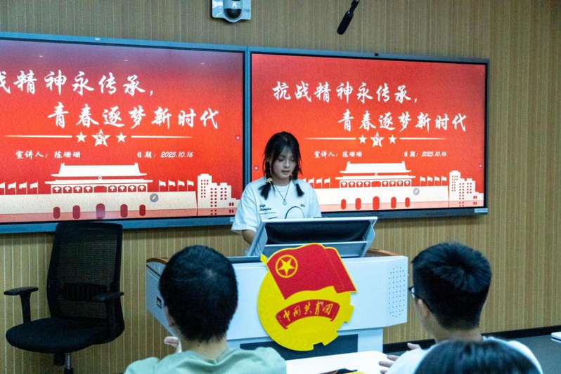 为纪念中国人民抗日战争暨世界反法西斯战争胜利80周年,引导广大青年铭记历史、缅怀先烈、传承精神、开创未来,近日,物电学院物电之声读书社于教学楼举办“物电青年说”之“忆峥嵘岁月,传承抗战精神”主题宣讲活动。本次活动由2024级机械电子工程班团支部承办,支部全体成员参加。