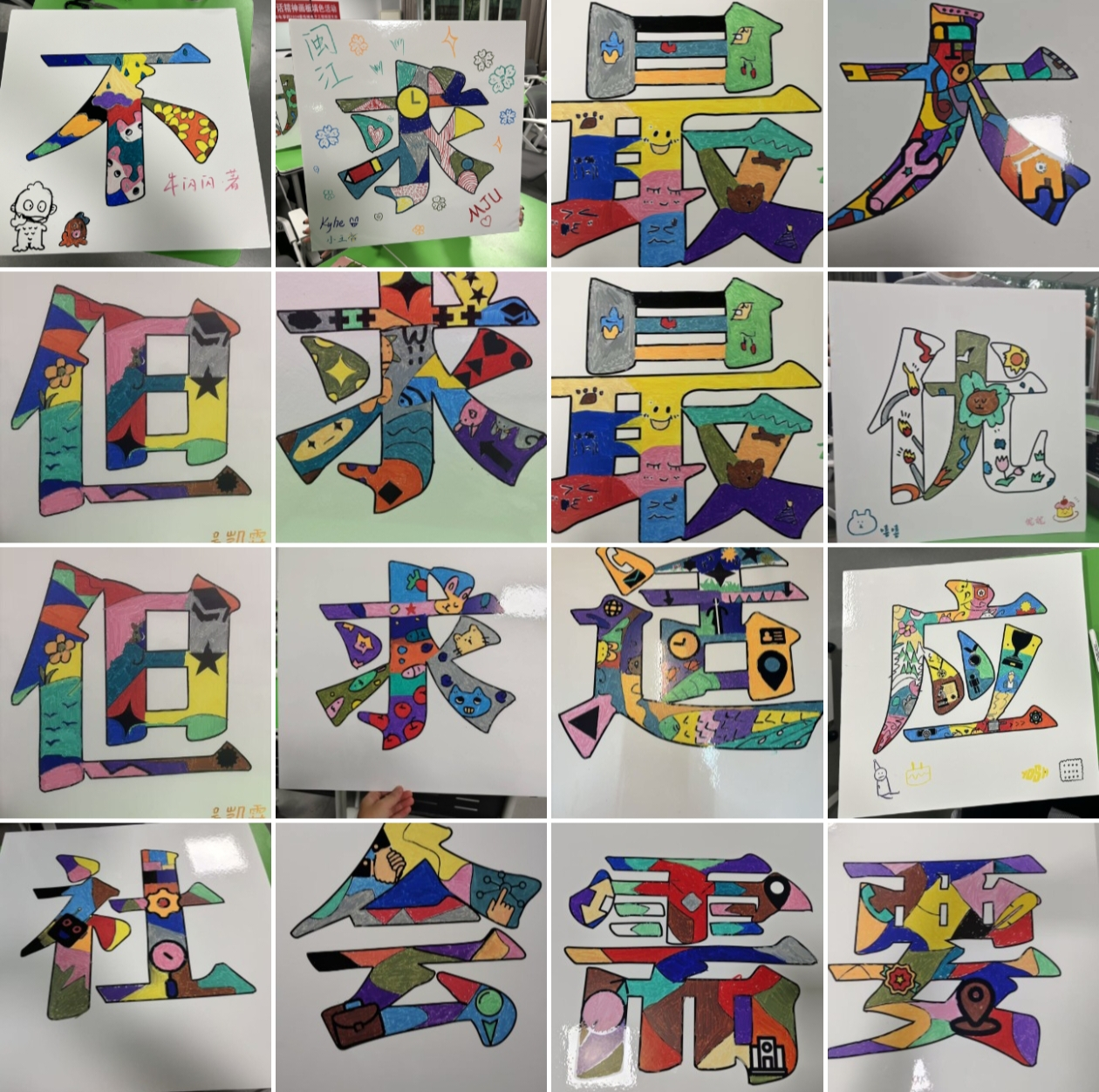 活动现场,涂色环节成为了全场的亮点。团支部精心准备了巨幅手卡和画笔,印有习近平总书记提出的办学理念:“不求最大,但求最优,但求适应社会需要”。同学们围坐一圈,挥毫涂色:深蓝色象征着“最优”的沉稳,橙红色代表着“适应社会需要”的热忱,翠绿色勾勒出“不求最大”的坚守。每一笔每一画,都是对这一理念的深刻体悟和生动表达。