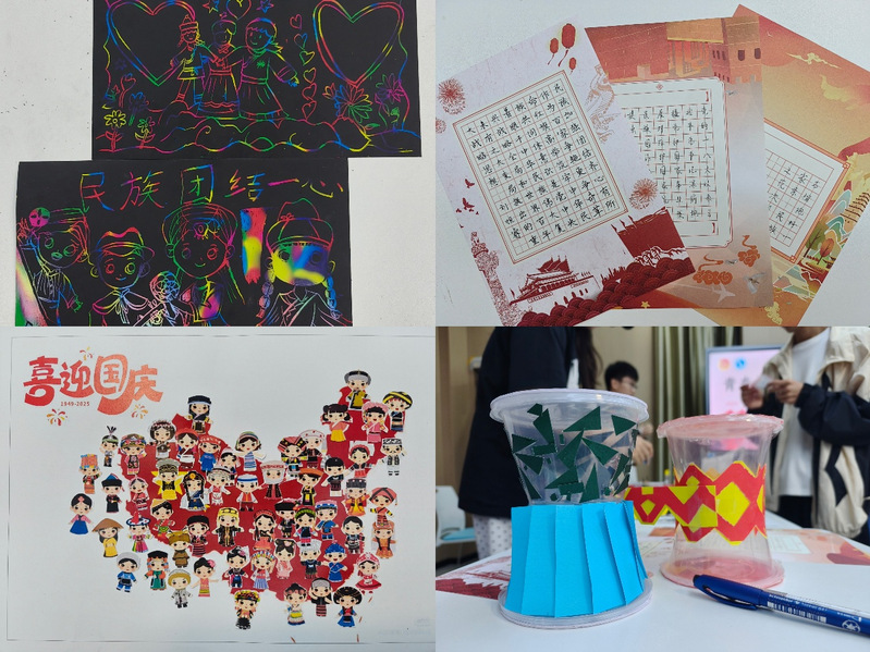 本次活动设有手绘铜鼓、黏土画、书签制作、书法写作、剪贴画、刮画六个创作活动形式,同学们选择个人感兴趣的活动形式参与其中。同学们通过优美的作品,描绘各民族和谐相处的生动场景,展现中华文化的多样性与统一性,勾勒出民族团结的绚丽图景。引人关注的是,手绘铜鼓的同学们在原本壮族铜鼓的样式上加入个人创意,用创新形式体验非遗文化魅力。