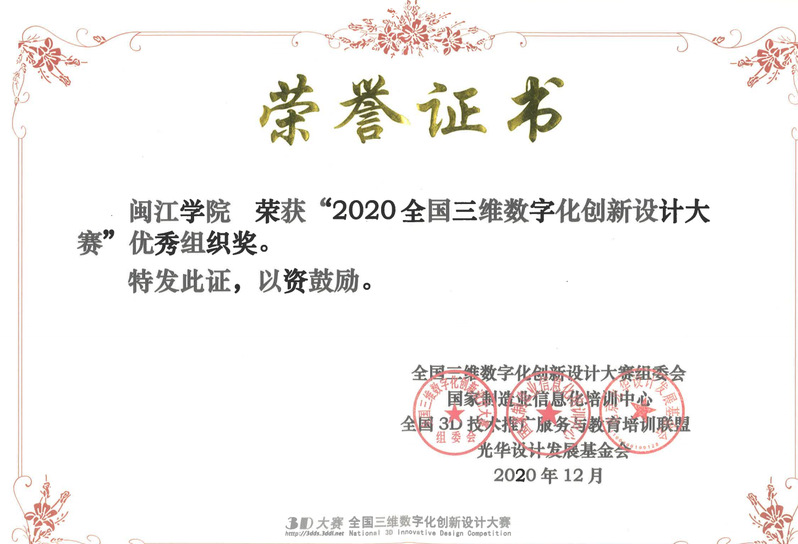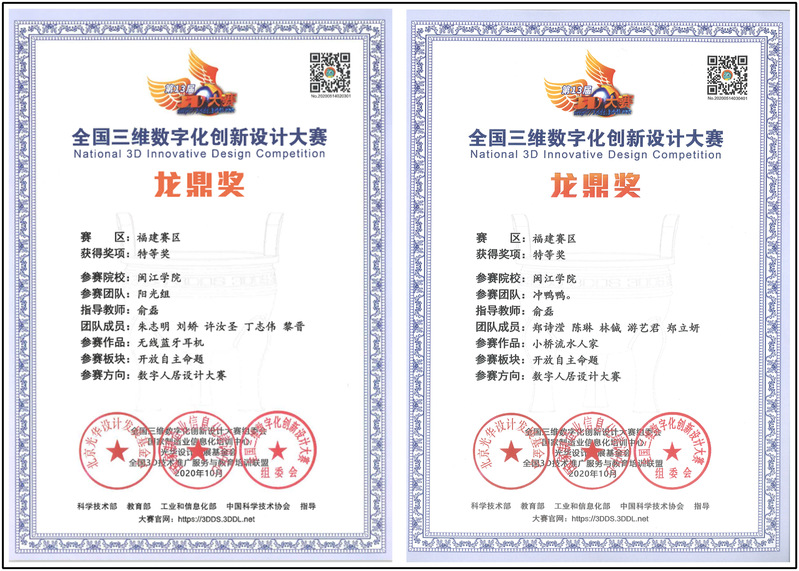 本次大赛从2020年4月份正式报名至今,前后经历了长达七个月的筹备与各级别的选拔。此次物电学院3D协会承担色色啦 的赛事组织工作,组织了113人参加了大赛,物电学院俞磊老师带领的学生队伍获得全国三维数字化创新设计大赛国赛一等奖1项,国赛三等奖1项,省赛特等奖2项。美术学院郑桢老师和刘家茂老师带领的学生队伍分别获得省赛一等奖、三等奖各1项。此次获奖人次和获奖等级均创下色色啦 在该项赛事中的新高!色色啦 获得2020全国三维数字化创新设计大赛优秀组织奖。