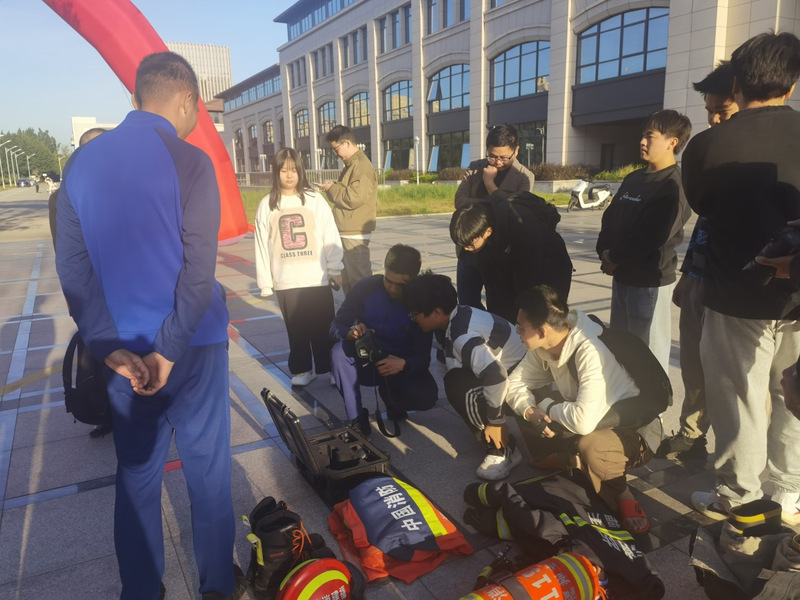 消防队员鼓励并指导师生们亲身体验、操作消防器材,试穿消防救援服。穿着沉重的救援服,背上救援设备,绕图书馆跑一圈,同学们气喘吁吁,对消防员的辛苦有了切身体会。