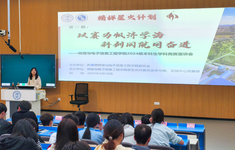 为发挥朋辈引领作用,激发新生对学科竞赛的探索热情,构建高低年级学生间良性互动、经验传承的成长机制,4月16日,物电学院精心举办“榜样星火计划”第二期主题活动——“以赛为帆济学海,科创闽院同奋进”2024级本科生学科竞赛宣讲会。活动由院学生会学习部与三创中心竞赛部联合承办,共邀请九位来自2022级与2023级“竞赛达人”倾情分享,学习部指导老师白洁玉主持,2024级全体本科生积极参与。