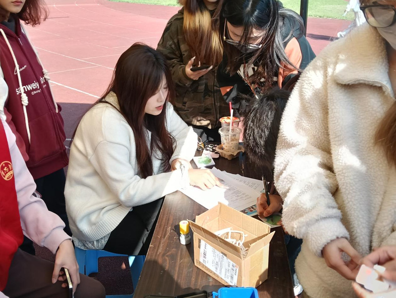 活动当天,志愿者们在致强田径场支起帐篷。同学们纷纷来到现场,领取集章小卡片,开启了一次别开生面的“环保游戏探险”。