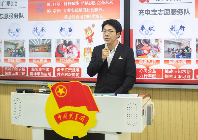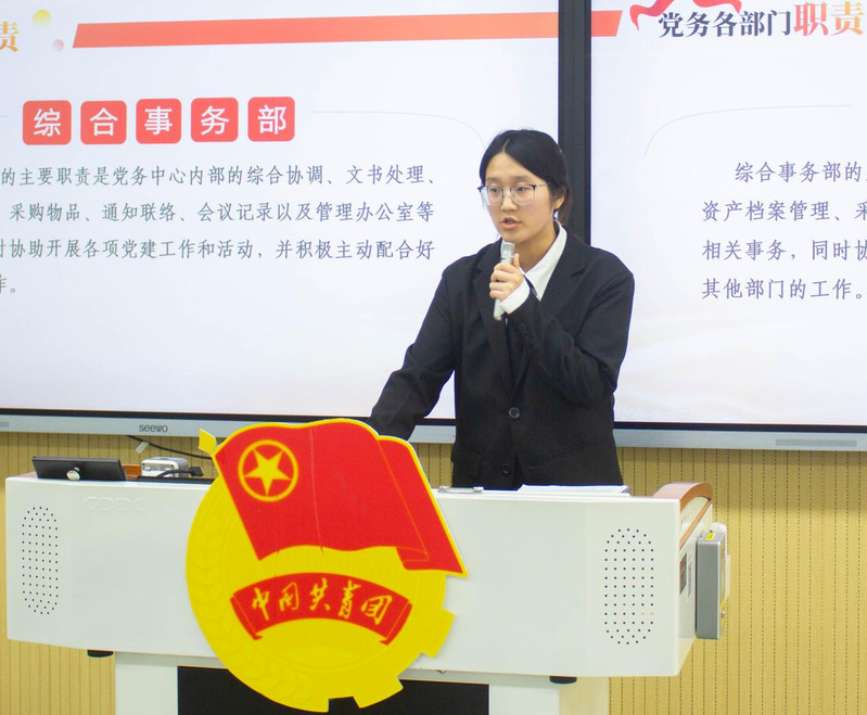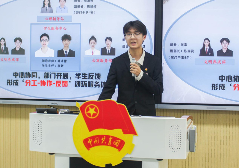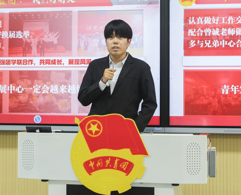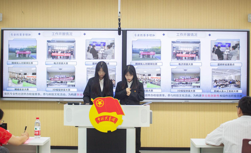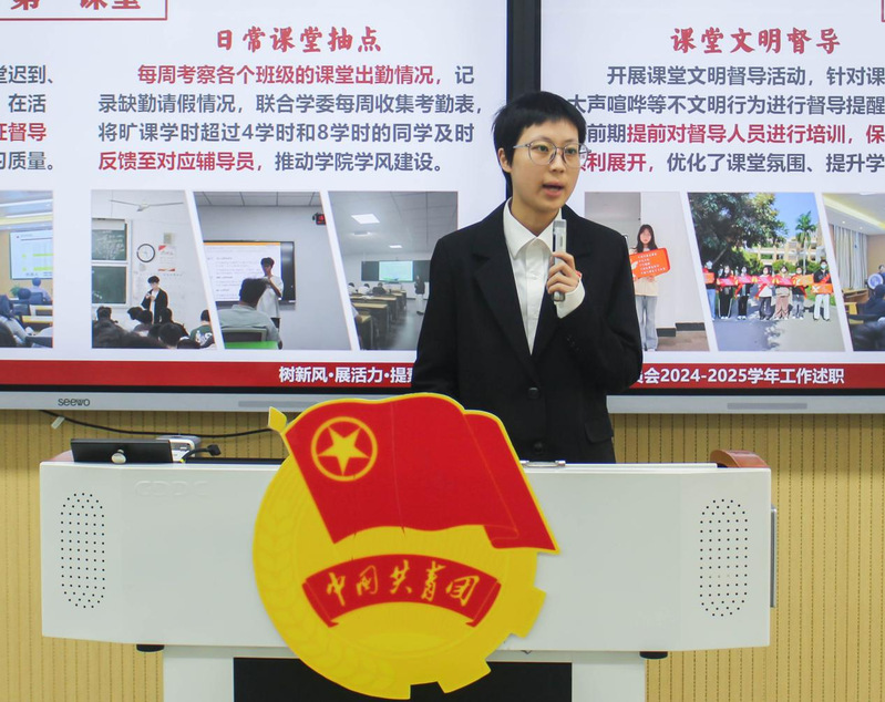 伴随着共青团团歌,学生会主席、团委学生副书记、各中心主任等学生干部依次上台述职,对一学年来的工作情况进行全面汇报,并对下个阶段的任务和目标进行了总结反思。