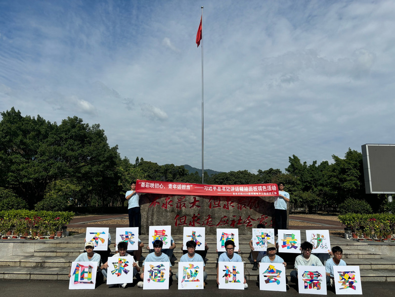 活动现场,涂色环节成为了全场的亮点。团支部精心准备了巨幅手卡和画笔,印有习近平总书记提出的办学理念:“不求最大,但求最优,但求适应社会需要”。同学们围坐一圈,挥毫涂色:深蓝色象征着“最优”的沉稳,橙红色代表着“适应社会需要”的热忱,翠绿色勾勒出“不求最大”的坚守。每一笔每一画,都是对这一理念的深刻体悟和生动表达。