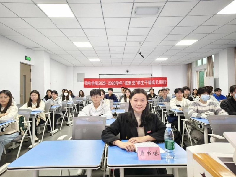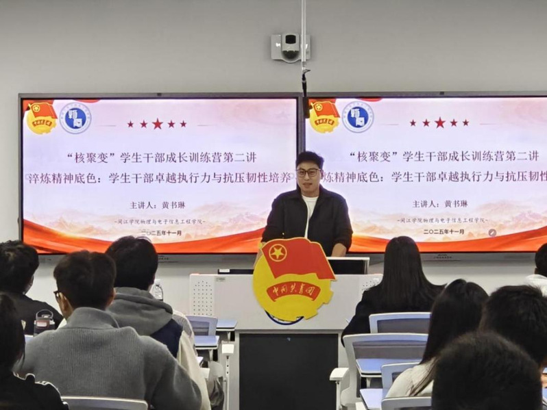 为提升学生干部的综合能力,帮助他们高效应对工作压力、增强责任意识与实践能力,11月12日,物电学院“核聚变”学生干部成长训练营举办第二讲:淬炼精神底色——学生干部卓越执行力与抗压韧性培养。活动由学院团委书记林方辉老师主持,特邀全国高校思政课教学展示二等奖获得者、校马克思主义学院黄书琳老师担任主讲。