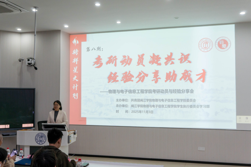 为发挥学院研究生示范引领作用、强化本硕联动交流,助力本科生厘清考研路径、掌握科学备考策略,11月3日,物电学院成功举办“榜样星火计划”第八期:2023级本科生考研动员与经验分享会。活动由学院学生会学习部承办,特邀学院党委副书记张林雯、银龄教师陈曦耀教授、团委书记林方辉到场点评,2025级电子信息(控制工程)专业研究生代表邱佳弘、马杰作经验分享,辅导员白洁玉、赖侹征主持,2023级全体本科生参加,现场气氛热烈、交流充分。