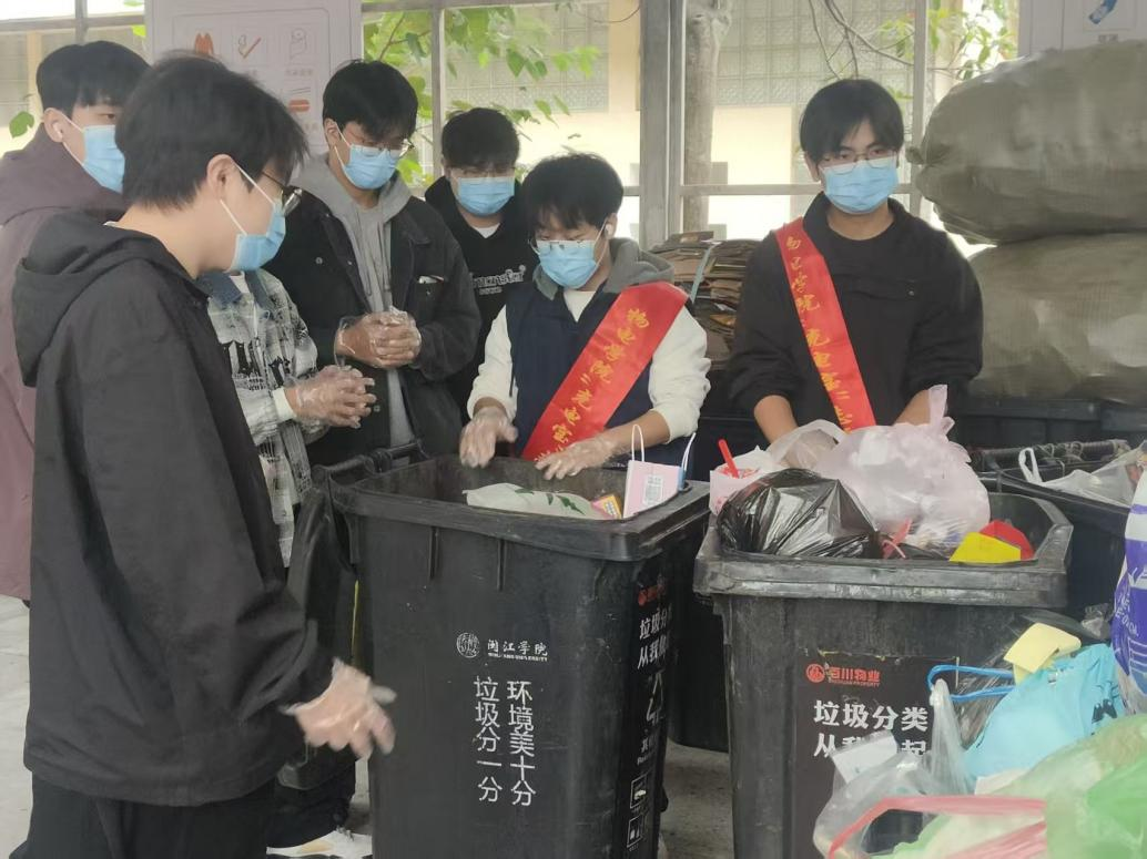 随后,学生们前往求实社区二号楼垃圾分类亭,实地观摩垃圾分类的分拣操作流程。在垃圾分类负责人的引导下,学生们亲自上阵,体验垃圾分拣环节,并积极指导前来投放垃圾的同学正确分类。在实践中,学生们不仅巩固了所学知识,更体会到了垃圾分类工作的细致与重要。